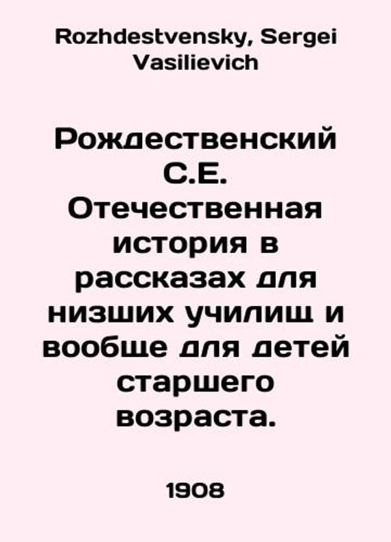 A Christmas story for lower schools and for older children in general. In Russian /Rozhdestvenskiy S.E. Otechestvennaya istoriya v rasskazakh dlya nizshikh uchilishch i voobshche dlya detey starshego vozrasta. 22nd edition. St. Petersburg. Schmidt. 1908. 278 p. We have thousands of titles and often several copies of each title may be available. Please feel free to contact us for a detailed description of the copies available. SKUalb84bfbe171aa42550.