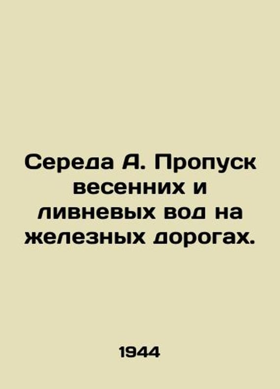 Sereda A. Skipping spring and storm water on railways. In Russian /Sereda A. Propusk vesennikh i livnevykh vod na zheleznykh dorogakh. In Russian. 1944. 120 p. We have thousands of titles and often several copies of each title may be available. Please feel free to contact us for a detailed description of the copies available. SKUalb85f242140aa07f59