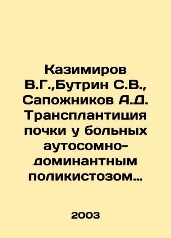 Kazimirov V.G., Butrin S.V., Bopozhnikov A.D. Kidney transplantation in patients with autosomal dominant polycystic kidney disease. In Russian /Kazimirov V.G., Butrin S.V., Sapozhnikov A.D. Transplantitsiya pochki u bolnykh autosomno-dominantnym polikistozom pochek. In Russian. Volgograd State Institution of Publishers, 2003 112s. We have thousands of titles and often several copies of each title may be available. Please feel free to contact us for a detailed description of the copies available. SKUalb866705b566128a7d