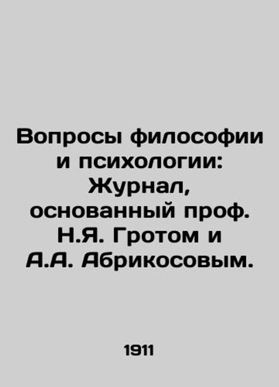 Questions of Philosophy and Psychology: The Journal founded by Prof. N.Y. Groth and A.A. Apricosov. In Russian /Voprosy filosofii i psikhologii: Zhurnal, osnovannyy prof. N.Ya. Grotom i A.A. Abrikosovym. In Russian. Year XXII. Edited by L.M. Lopatin. Book II (107). March-April 1911. Publication of the Moscow Psychological Society with the assistance of the St. Petersburg Philosophical Society. M: Typolithography of the I.N. Kouchnerev m Ko Partnership, 1911. 4, 111-186, 129-250, 12 p. Format: 25,5x17 sm. We have thousands of titles and often several copies of each title may be available. Please feel free to contact us for a detailed description of the copies available. SKUalb86695453b97d31bd