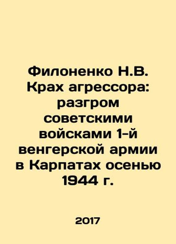 N.V. Filonenkos Crash of the Aggressor: Soviet Troops Defeat of the First Hungarian Army in the Carpathians in the Fall of 1944 In Russian /Filonenko N.V. Krakh agressora: razgrom sovetskimi voyskami 1-y vengerskoy armii v Karpatakh osenyu 1944 g. In Russian. Monograph Voronezh VGAU 2017. 229 p. We have thousands of titles and often several copies of each title may be available. Please feel free to contact us for a detailed description of the copies available. SKUalb866a1778a3bae9d0