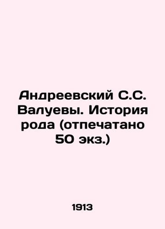 Andreevsky S. Valuevs. History of the genus (printed 50 copies) In Russian (ask us if in doubt)/Andreevskiy S.S. Valuevy. Istoriya roda (otpechatano 50 ekz.) Short description: In Russian (ask us if in doubt).The book is written by Sergey Sergievich Andreevsky the governor of Oryol and the staff master of the Supreme Court who emigrated after 1917. A rare antique edition dedicated to the genealogy of a separate noble family the Valuevs numbering many remarkable people in the history of our country. The Valuevs are members of the Countess family who used to be boyars. Valuevs were the original owners of Valuevs Parish. We have thousands of titles and often several copies of each title may be available. Please feel free to contact us for a detailed description of the copies available. SKUalb86abb560faea68c9