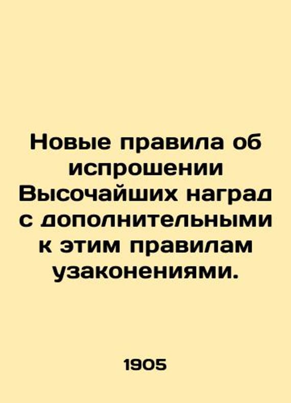 New rules on the request of the Highest Decorations with additional regulations to these rules. In Russian (ask us if in doubt)/Novye pravila ob isproshenii Vysochayshikh nagrad s dopolnitelnymi k etim pravilam uzakoneniyami. Publishing House of M.Merkushev St. Petersburg 1905 64 p. SKUalb8773669b919c2747.