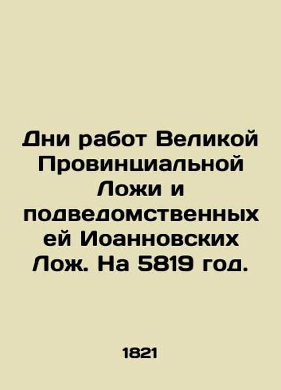 The days of the work of the Grand Provincial Lodge and its subordinate St. Johns Lodge. In 5819. In Russian (ask us if in doubt)/Dni rabot Velikoy Provintsialnoy Lozhi i podvedomstvennykh ey Ioannovskikh Lozh. Na 5819 god. Short description: In Russian (ask us if in doubt).1821. We have thousands of titles and often several copies of each title may be available. Please feel free to contact us for a detailed description of the copies available. SKUalb87f33f18901ec308