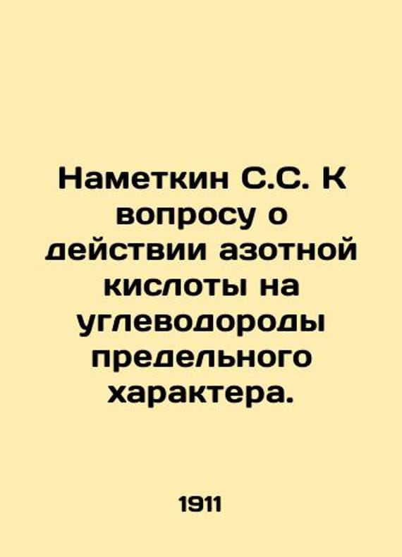 Nametkin S.S. On the effect of nitric acid on hydrocarbons of a marginal character. In Russian /Nametkin S.S. K voprosu o deystvii azotnoy kisloty na uglevodorody predelnogo kharaktera. Nametkin S.S. On the effect of nitric acid on hydrocarbons of a marginal character. We have thousands of titles and often several copies of each title may be available. Please feel free to contact us for a detailed description of the copies available. SKUalb881f316a856b02a8.