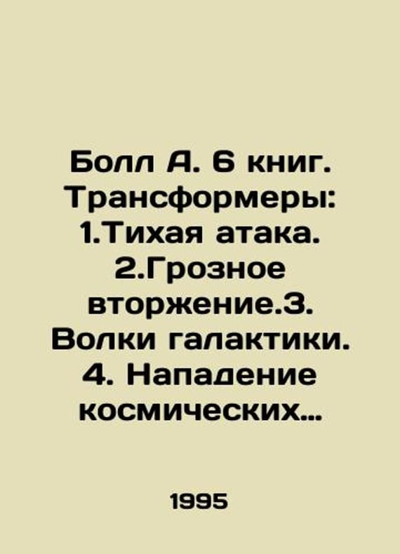 Ball A. 6 books. Transformers: 1. Silent attack. 2. Terrible invasion. 3. Wolves of the galaxy. 4. Attack of space spiders. 5. Reserve of the Empire. 6. Battle of the giants. In Russian /Boll A. 6 knig. Transformery: 1.Tikhaya ataka. 2.Groznoe vtorzhenie.3. Volki galaktiki. 4. Napadenie kosmicheskikh paukov. 5. Rezerv Imperii. 6. Bitva gigantov. In Russian. Library of childrens combat fiction series. Minsk. Harvest 1995. Transformers: 1. Silent attack. 2. Terrible invasion. 3. Wolves of the galaxy. 4. Attack of space spiders. 5. Reserve of the Empire. 6. Battle of the giants. We have thousands of titles and often several copies of each title may be available. Please feel free to contact us for a detailed description of the copies available. SKUalb88fd9f6fdee1ac15