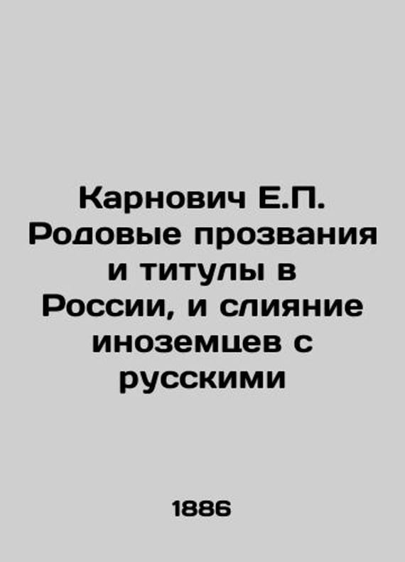 Karnovych E.P. Family nicknames and titles in Russia and the merging of foreigners with Russians In Russian (ask us if in doubt)/Karnovich E.P. Rodovye prozvaniya i tituly v Rossii i sliyanie inozemtsev s russkimi Short description: In Russian (ask us if in doubt).St. Petersburg edition of A.S. Suvorin 1886. 4 248 2c. We have thousands of titles and often several copies of each title may be available. Please feel free to contact us for a detailed description of the copies available. SKUalb8959220802022ca0