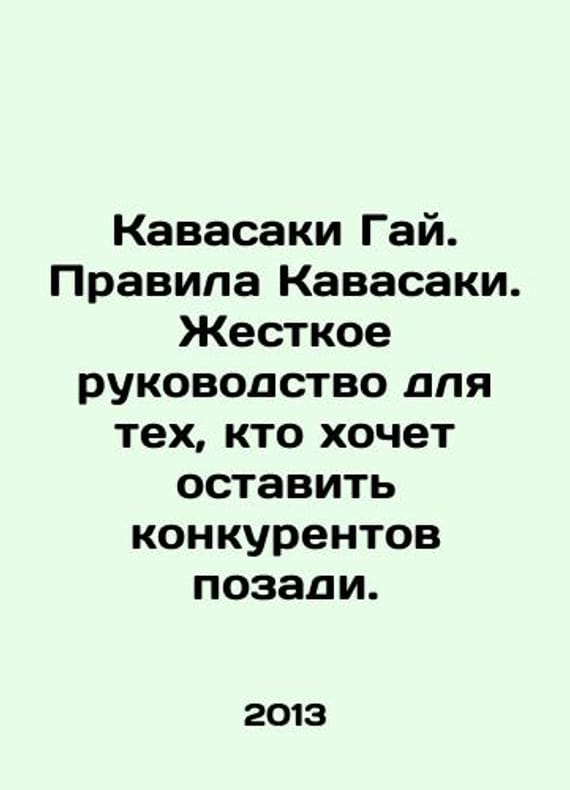 Kawasaki Guy. Kawasaki Rules. A tough guide for those who want to leave competitors behind. In Russian /Kavasaki Gay. Pravila Kavasaki. Zhestkoe rukovodstvo dlya tekh, kto khochet ostavit konkurentov pozadi. In Russian. M.: Mann, Ivanov and Ferber, 2013, 528 pp. We have thousands of titles and often several copies of each title may be available. Please feel free to contact us for a detailed description of the copies available. SKUalb89c78c1a25781e83
