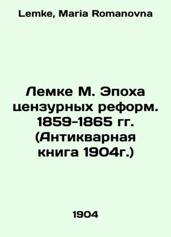 Lemke M. The Age of Censorship Reforms. 1859-1865 (Antique Book 1904) In Russian /Lemke M. Epokha tsenzurnykh reform. 1859-1865 gg. (Antikvarnaya kniga 1904g.) St. Petersburg Book Publishing House by M.V. Pirozhkov, Typo-lithography by Herold 1904, 512 and IXc. We have thousands of titles and often several copies of each title may be available. Please feel free to contact us for a detailed description of the copies available. SKUalb89ef01c10089d9c7.