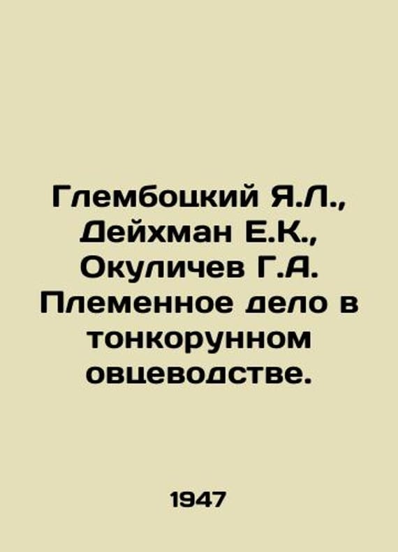Glembotsky Ya.L., Deichman E.K., Okulichev G.A. Tribal business in thin-handed sheep farming. In Russian /Glembotskiy Ya.L., Deykhman E.K., Okulichev G.A. Plemennoe delo v tonkorunnom ovtsevodstve. In Russian. M. Ogiz. 1947. 320 p. We have thousands of titles and often several copies of each title may be available. Please feel free to contact us for a detailed description of the copies available. SKUalb8a84867a97f9d586