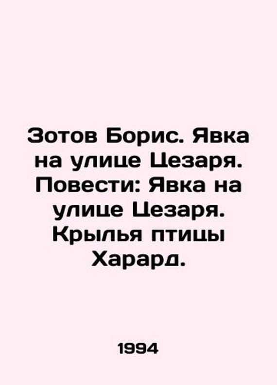Boris Zotov. Turnout on Caesar Street. Tales: Turnout on Caesar Street. Harard Bird Wings. In Russian /Zotov Boris. Yavka na ulitse Tsezarya. Povesti: Yavka na ulitse Tsezarya. Krylya ptitsy Kharard. In Russian. Russian Detective. Editor Vladimir Kavtorin. Original layout Yuri Smirennikov. St. Petersburg. Library of the Stars. 1994. 256 p. We have thousands of titles and often several copies of each title may be available. Please feel free to contact us for a detailed description of the copies available. SKUalb8b5769fcdb026939