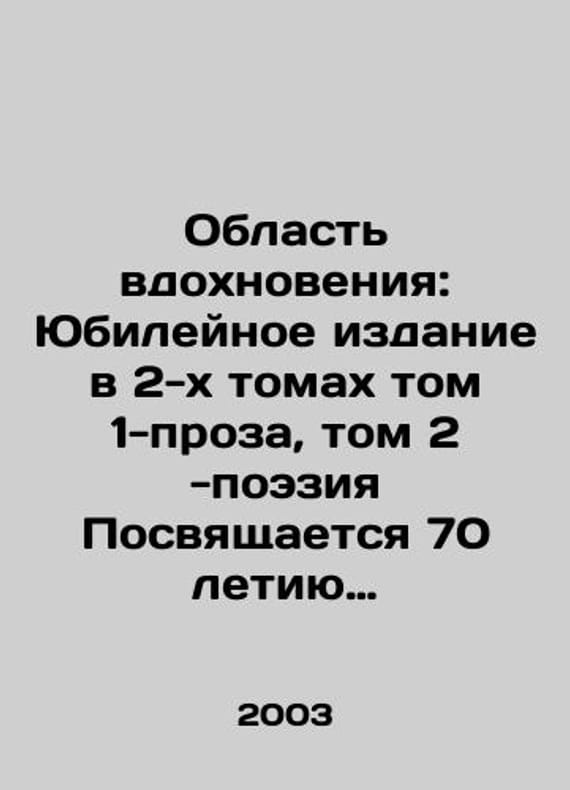 Area of Inspiration: Jubilee Edition in two volumes of volume 1-prose, volume 2-poetry Dedicated to the 70th anniversary of Chelyabinsk region In Russian /Oblast vdokhnoveniya: Yubileynoe izdanie v 2-kh tomakh tom 1-proza, tom 2 -poeziya Posvyashchaetsya 70 letiyu Chelyabinskoy oblasti. Avtor proekta Semyannikov S., sost. Shanbatuev M. In Russian. helyabinsk South Ural Book Publishing House, 2003 448 p We have thousands of titles and often several copies of each title may be available. Please feel free to contact us for a detailed description of the copies available. SKUalb8b862d7fef77e28e