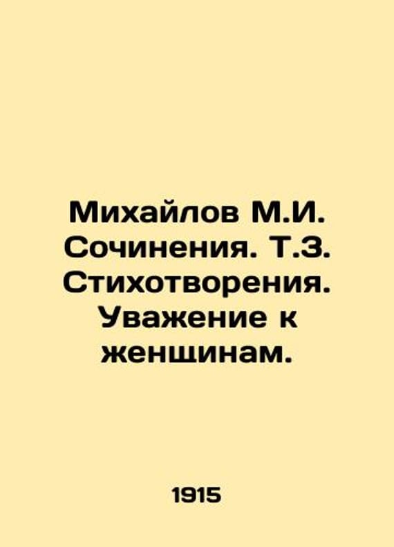 Mikhailov M.I. Works. V.3. Poems. Respect for Women. In Russian /Mikhaylov M.I. Sochineniya. T.3. Stikhotvoreniya. Uvazhenie k zhenshchinam. Free supplement to Awakening. 1915. We have thousands of titles and often several copies of each title may be available. Please feel free to contact us for a detailed description of the copies available. SKUalb8b98edf5513673d3.