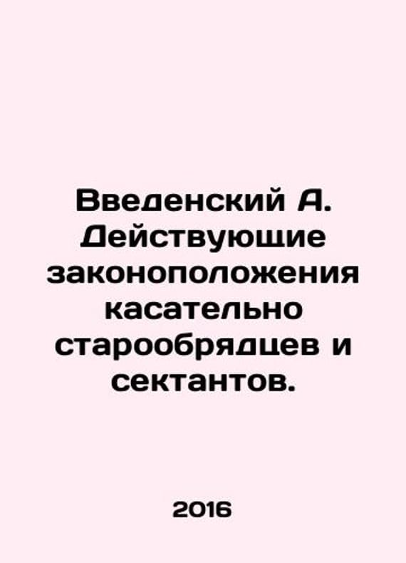 A. Existing legal provisions concerning Old Believers and Sectarians. In Russian /Vvedenskiy A. Deystvuyushchie zakonopolozheniya kasatelno staroobryadtsev i sektantov. In Russian. Model 5 Moscow Publishing House, V. Sekachev, 2016 208s. We have thousands of titles and often several copies of each title may be available. Please feel free to contact us for a detailed description of the copies available. SKUalb8e4b1e1ca1ce646b