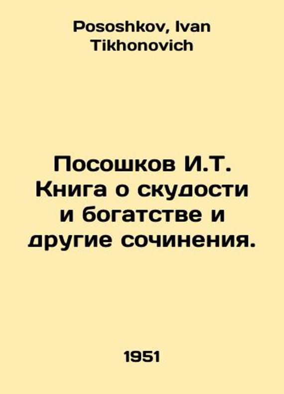 Poshkov I.T. A book about poverty and wealth and other writings. In Russian /Pososhkov I.T. Kniga o skudosti i bogatstve i drugie sochineniya. Series: Literary Monuments. Moscow Academy of Sciences of the USSR, 1951. 409s. We have thousands of titles and often several copies of each title may be available. Please feel free to contact us for a detailed description of the copies available. SKUalb8f8a52daa2f8108a.