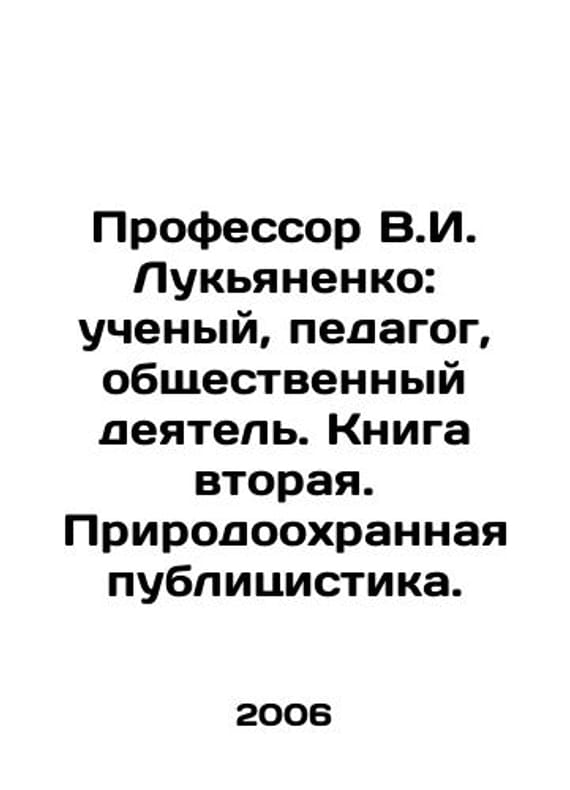Professor V.I. Lukyanenko: scientist, pedagogue, public figure. Book two. Environmental journalism. In Russian /Professor V.I. Lukyanenko: uchenyy, pedagog, obshchestvennyy deyatel. Kniga vtoraya. Prirodookhrannaya publitsistika.To the 70th anniversary of the birth and the 45th anniversary of the scientific, pedagogical and social activities of Professor V.I. Lukyanenko. Yaroslavl VBO REA-IPC Indigo-Yaroslavl 2006.We have thousands of titles and often several copies of each title may be available. Please feel free to contact us for a detailed description of the copies available. SKUalb918a6a4abc802558.