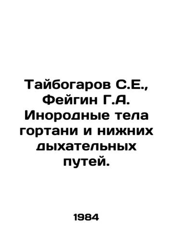 Taibogarov S.E., Feigin G.A. Foreign bodies of the larynx and lower respiratory tract. In Russian /Taybogarov S.E., Feygin G.A. Inorodnye tela gortani i nizhnikh dykhatelnykh putey. In Russian. Almaty Kazakhstan 1984. 136 p. We have thousands of titles and often several copies of each title may be available. Please feel free to contact us for a detailed description of the copies available. SKUalb91d76f43b228b70d