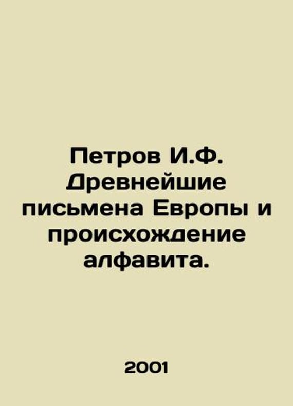 Petrov I.F. The oldest letters in Europe and the origin of the alphabet. In Russian /Petrov I.F. Drevneyshie pismena Evropy i proiskhozhdenie alfavita. M. I. F. Petrov 2001. We have thousands of titles and often several copies of each title may be available. Please feel free to contact us for a detailed description of the copies available. SKUalb92d6d8d1783785b3.