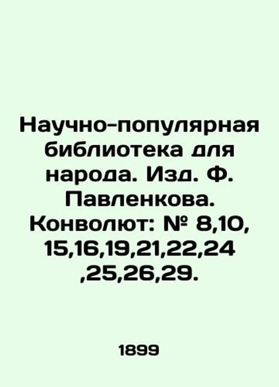Popular Scientific Library for the People. F. Pavlenkov Publishing House. Convolute: # 8 10 15 16 19 21 22 24 25 26 29. In Russian (ask us if in doubt)/Nauchno-populyarnaya biblioteka dlya naroda. Izd. F. Pavlenkova. Konvolyut: # 8 10 15 16 19 21 22 24 25 26 29. S-Pb. Type T-V Public Pole. 1899-1891. 60 and 80 and 52 and 56 and 80 and 71 and 52 and 68 and 112 and 54 s. We have thousands of titles and often several copies of each title may be available. Please feel free to contact us for a detailed description of the copies available. SKUalb93ac9014131edc28