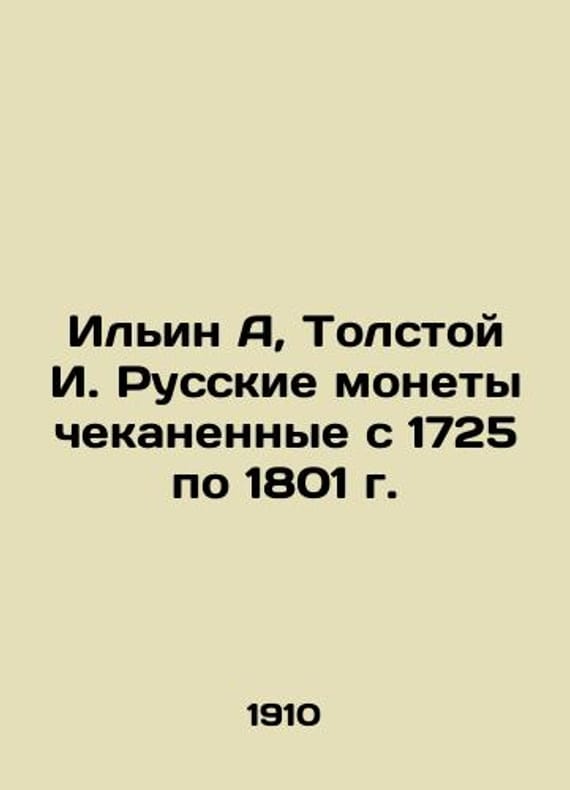 Ilyin A, Tolstoy I. Russian coins minted from 1725 to 1801 In Russian /Ilin A, Tolstoy I. Russkie monety chekanennye s 1725 po 1801 g. In Russian. Reprinted edition of St. Petersburg. Edition of A.Ilyins Cartographic Institution 1910. 132 p. We have thousands of titles and often several copies of each title may be available. Please feel free to contact us for a detailed description of the copies available. SKUalb93bf5a65b8c5905b