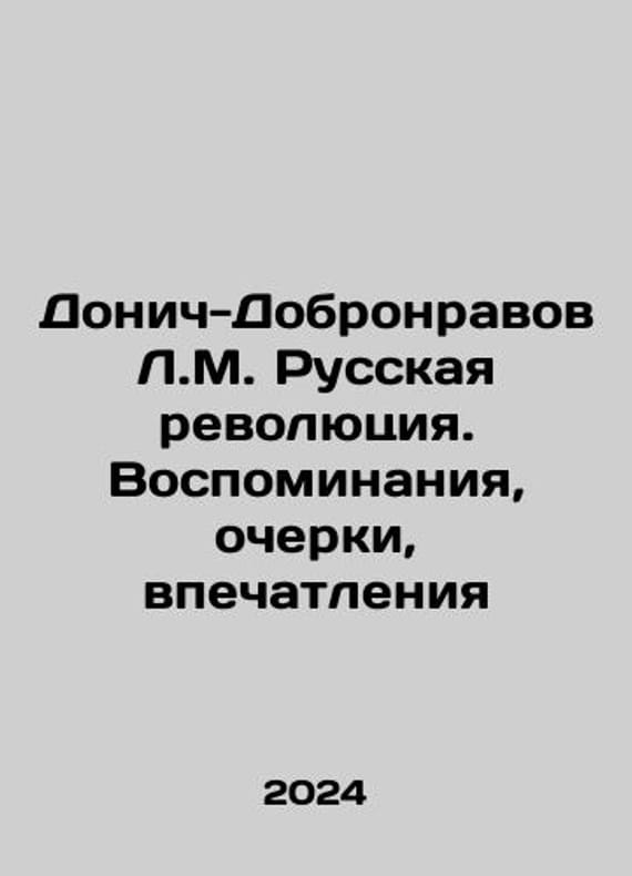 Donich-Dobronravov L.M. The Russian Revolution. Memories, Essays, Impressions In Russian /Donich-Dobronravov L.M. Russkaya revolyutsiya. Vospominaniya, ocherki, vpechatleniya In Russian. Moscow-St. Petersburg Nestor-History 2024. 304 p. We have thousands of titles and often several copies of each title may be available. Please feel free to contact us for a detailed description of the copies available. SKUalb948ef320fdb6680c