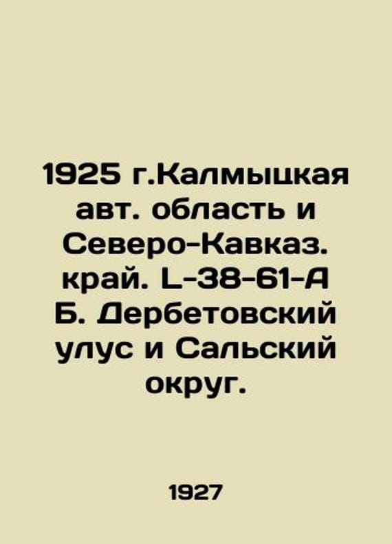 1925 Kalmyk Autonomous Region and North Caucasus Region. L-38-61-A B. Derbetov Ulus and Salsky District. In Russian /1925 g.Kalmytskaya avt. oblast i Severo-Kavkaz. kray. L-38-61-A B. Derbetovskiy ulus i Salskiy okrug. In Russian. Scale 1: 50 000 M. The Geodetic Committee of the WCNH-USSR. 1927. 1 sheet. We have thousands of titles and often several copies of each title may be available. Please feel free to contact us for a detailed description of the copies available. SKUalb94b83fc74f1bd285