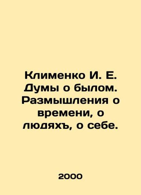 I. E. Dumas Klimenko about the past. Reflections on time, about people, about myself. In Russian /Klimenko I. E. Dumy o bylom. Razmyshleniya o vremeni, o lyudyakh, o sebe. In Russian. 3rd amended edition of Smolensk: Regional Journalism Organization, 2000, 552 p. We have thousands of titles and often several copies of each title may be available. Please feel free to contact us for a detailed description of the copies available. SKUalb95a40ccbb0aed056