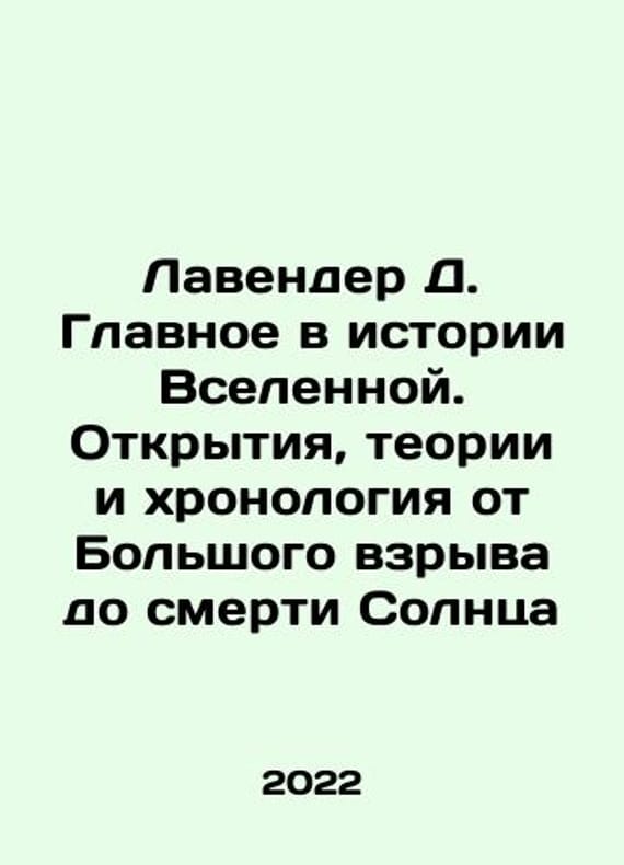 Lavender D. The most important thing in the history of the universe: discoveries, theories, and chronology from the Big Bang to the death of the Sun In Russian /Lavender D. Glavnoe v istorii Vselennoy. Otkrytiya, teorii i khronologiya ot Bolshogo vzryva do smerti Solntsa In Russian. M Mann, Ivanov and Ferber 2022 224s. We have thousands of titles and often several copies of each title may be available. Please feel free to contact us for a detailed description of the copies available. SKUalb95ba7975a260195a