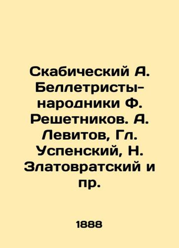 Skabichesky A. F. Reshetnikov, A. Levitov, Chapter Uspensky, N. Zlatovratsky, etc. In Russian /Skabicheskiy A. Belletristy-narodniki F. Reshetnikov. A. Levitov, Gl. Uspenskiy, N. Zlatovratskiy i pr. In Russian. Critical Essays Saint Petersburg Typography by V. S. Balashev, 1888. We have thousands of titles and often several copies of each title may be available. Please feel free to contact us for a detailed description of the copies available. SKUalb962942678ba16e9c