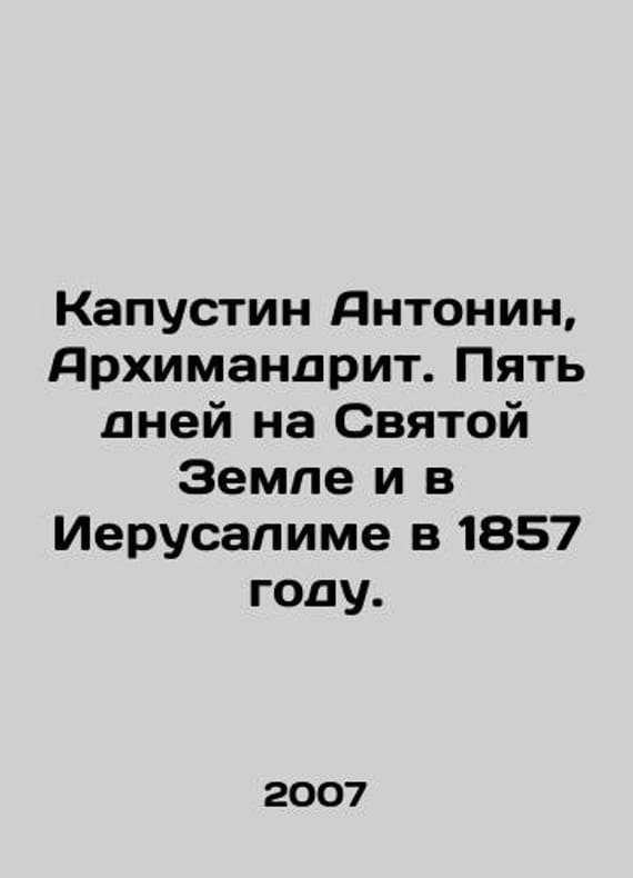 Kapustin Antonin, Archimandrite. Five days in the Holy Land and Jerusalem in 1857. In Russian /Kapustin Antonin, Arkhimandrit. Pyat dney na Svyatoy Zemle i v Ierusalime v 1857 godu. In Russian. M Indrik 2007. We have thousands of titles and often several copies of each title may be available. Please feel free to contact us for a detailed description of the copies available. SKUalb96e31a1c9d8950e0