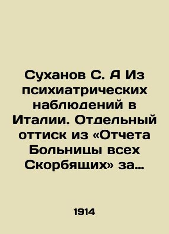 From Psychiatric Observations in Italy: A Separate Excerpt from the Report of the Hospital of All Grievers for 1913 In Russian (ask us if in doubt)/Sukhanov S. A Iz psikhiatricheskikh nablyudeniy v Italii. Otdelnyy ottisk iz ?????????«Otcheta Bolnitsy vsekh SFrom Psychiatric Observations in Italy: A Separate Excerpt from the Report of the Hospital of All Grievers for 1913 In Russian (ask us if in doubt)/Sukhanov S. A Iz psikhiatricheskikh nablyudeniy v Italii. Otdelnyy ottisk iz ?????????«Otcheta Bolnitsy vsekh Skorbyashchikh?????????» za 1913 gThe most interesting and rare edition in 24 pages We have thousands of titles and often several copies of each title may be available. Please feel free to contact us for a detailed description of the copies available. SKUalb975428e35cc97cef