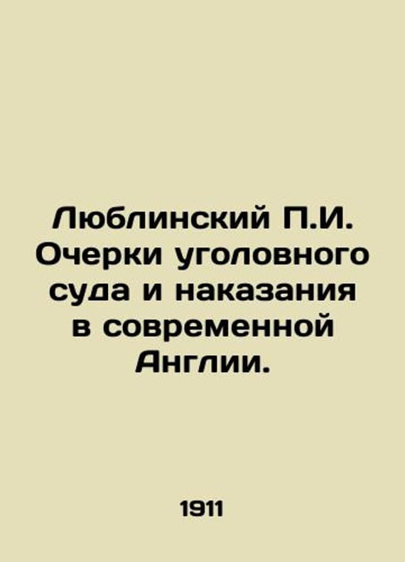 Lublin P.I. Essays on Criminal Court and Punishment in Modern England. In Russian (ask us if in doubt)/Lyublinskiy P.I. Ocherki ugolovnogo suda i nakazaniya v sovremennoy Anglii. Short description: In Russian (ask us if in doubt).St. Petersburg Senate Printing House 1911 VII + 2 n.a. + 715s. We have thousands of titles and often several copies of each title may be available. Please feel free to contact us for a detailed description of the copies available. SKUalb9c19f7b138a91991