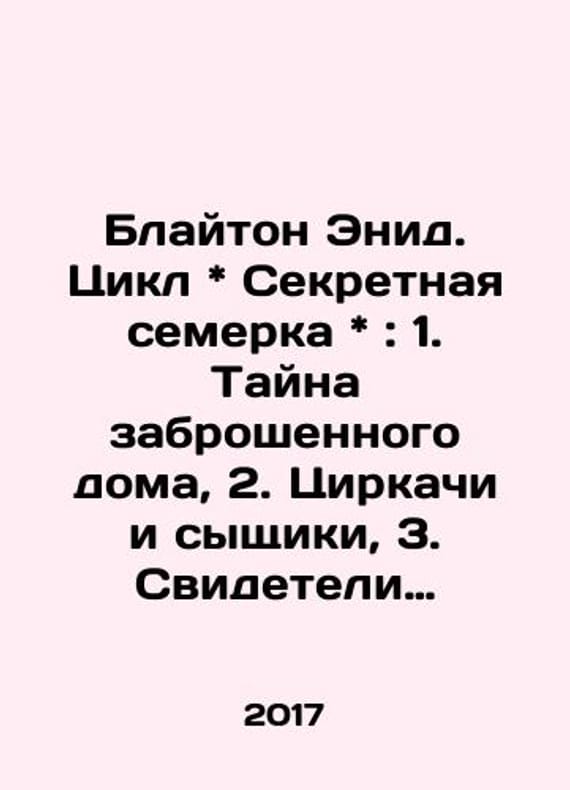 Blyton Enid. Cycle Secret Seven: 1. The Mystery of an Abandoned House, 2. Circuses and Detectives, 3. Witnesses to a Robbery, 4. Tigers Lair. (Set of 4 books). In Russian /Blayton Enid. Tsikl Sekretnaya semerka : 1. Tayna zabroshennogo doma, 2. Tsirkachi i syshchiki, 3. Svideteli ogrableniya, 4. Logovo tigra. (Komplekt iz 4 knig). Moscow Makhaon 2017. We have thousands of titles and often several copies of each title may be available. Please feel free to contact us for a detailed description of the copies available. SKUalb9db96ff2a2d69d69.
