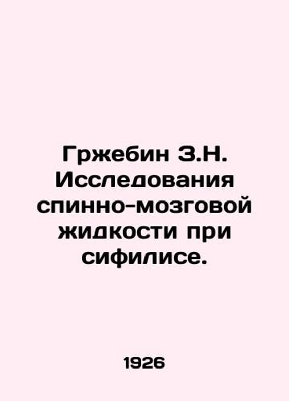 Grzhebin Z.N. Studies of cerebrospinal fluid in syphilis. In Russian /Grzhebin Z.N. Issledovaniya spinno-mozgovoy zhidkosti pri sifilise. A Short Practical Guide for Physicians. With 11 figures and 3 diagrams. With the foresight of Prof. N. S. Efron, director of the State Venus Institute of NKZ. State Venereological Institute of Moscow. Publishing House of the Peoples Commissariat of Health of the RSFSR. 1926. We have thousands of titles and often several copies of each title may be available. Please feel free to contact us for a detailed description of the copies available. The delivery of this book might be delayed beyond the usual timeframe due to extended processing and preparation before shipment, and faster shipping opSKUalb9e0338e45bd618a9