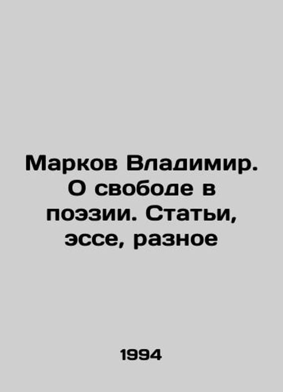 Vladimir Markov. On Freedom in Poetry. Articles, Essays, Miscellaneous In Russian /Markov Vladimir. O svobode v poezii. Stati, esse, raznoe St. Petersburg, Chernyshev Publishing House, 1994. 368 p. We have thousands of titles and often several copies of each title may be available. Please feel free to contact us for a detailed description of the copies available. SKUalb9e6df5fcad6fb02f.