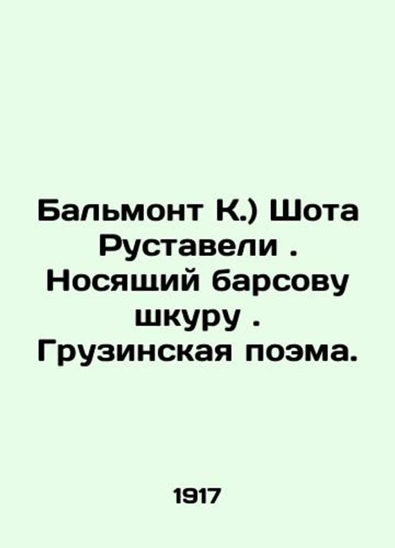 Balmont K.) Shota Rustaveli. Wearing leopard skin. A Georgian poem. In Russian /Balmont K.) Shota Rustaveli. Nosyashchiy barsovu shkuru. Gruzinskaya poema. Translation of Balmont Moscow Edition by Sabashnikov, 1917, 112 p. We have thousands of titles and often several copies of each title may be available. Please feel free to contact us for a detailed description of the copies available. SKUalb9e9174eec8b1641a.