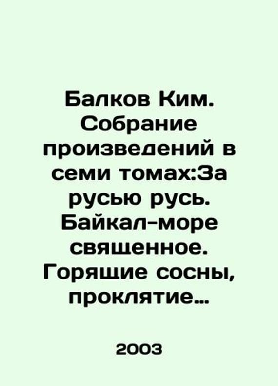 Balkov Kim. A collection of works in seven volumes: Beyond the Russian River. The Baikal Sea is sacred. Burning Pines, the Curse of Baalbek In Russian /Balkov Kim. Sobranie proizvedeniy v semi tomakh:Za rusyu rus. Baykal-more svyashchennoe. Goryashchie sosny, proklyatie baalbeka. Idu na vyIdushchie vo tmu. Ot ruki brata svoego. Kuda podevalos nebo. Budda Irkutsk Native Land. 2003-2012. We have thousands of titles and often several copies of each title may be available. Please feel free to contact us for a detailed description of the copies available. SKUalba0405f1fafaede8c.