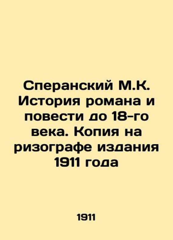 Speransky M.K. History of the novel and the novel up to the 18th century. Copy on the 1911 edition of the risograph In Russian /Speranskiy M.K. Istoriya romana i povesti do 18-go veka. Kopiya na rizografe izdaniya 1911 goda Notes by female students on lectures read at Moscows Higher Womens Course in 1910.11, 346s. We have thousands of titles and often several copies of each title may be available. Please feel free to contact us for a detailed description of the copies available. SKUalba0439dbcbe3f804d.