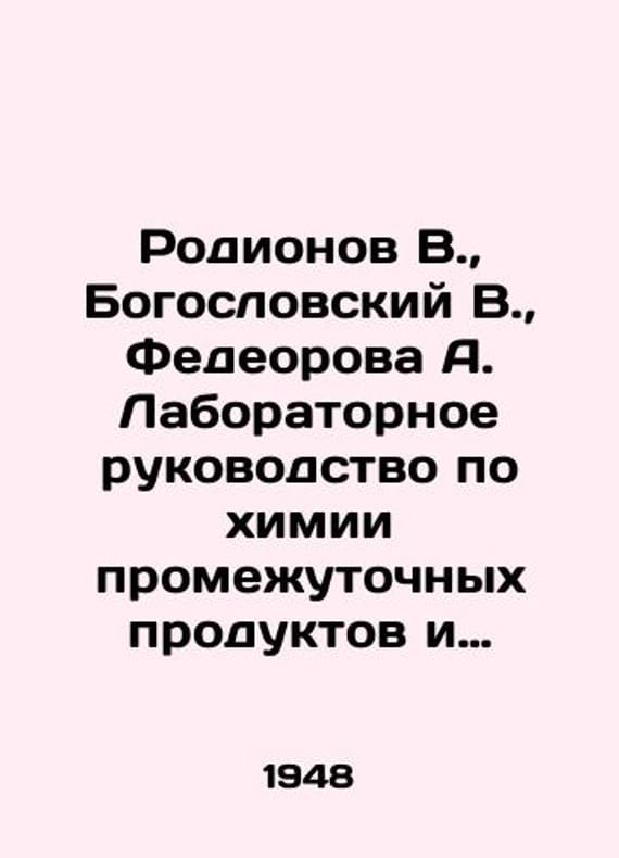Rodionov V. Bogoslovsky V. Feodorova A. Laboratory Guide to Chemistry of Intermediate Products and Colors. In Russian (ask us if in doubt)/Rodionov V. Bogoslovskiy V. Fedeorova A. Laboratornoe rukovodstvo po khimii promezhutochnykh produktov i krasiteley.State Chemizdat 1948. 212 p. We have thousands of titles and often several copies of each title may be available. Please feel free to contact us for a detailed description of the copies available. SKUalba051fba7018b0c66