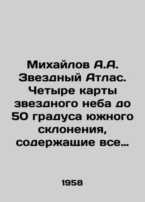 Mikhailov A.A. Star Atlas. Four maps of the starry sky up to 50 degrees south inclination, containing all stars up to 5.5 magnitudes In Russian /Mikhaylov A.A. Zvezdnyy Atlas. Chetyre karty zvezdnogo neba do 50 gradusa yuzhnogo skloneniya, soderzhashchie vse zvezdy do 5,5 velichiny 3rd edition revised by M.-L. Editions of the Academy of Sciences of the USSR 1958. We have thousands of titles and often several copies of each title may be available. Please feel free to contact us for a detailed description of the copies available. SKUalba0ecae4fbea9d7ef.