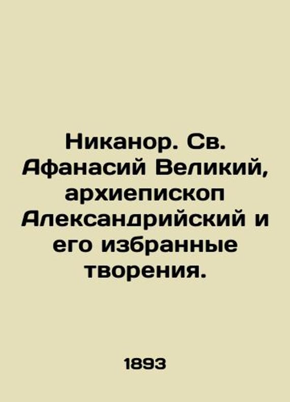 Nicanor, St. Athanasius the Great, Archbishop of Alexandria and his chosen creations. In Russian /Nikanor. Sv. Afanasiy Velikiy, arkhiepiskop Aleksandriyskiy i ego izbrannye tvoreniya. St. Petersburg: I.L. Tuzov, 1893.-319 p. 1893. 20x14 sm. We have thousands of titles and often several copies of each title may be available. Please feel free to contact us for a detailed description of the copies available. SKUalba144f88bbaa11398.
