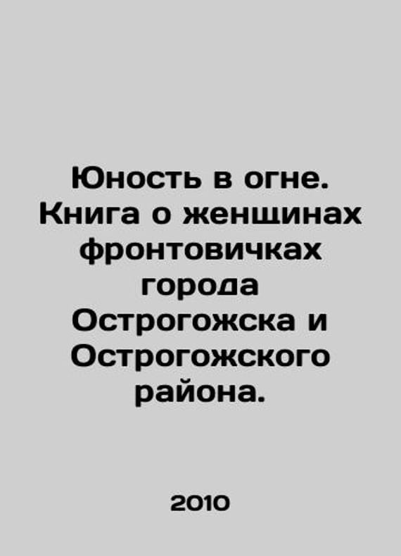 Youth on Fire. A book about women fighting in the city of Ostrogozhsk and the Ostrogozhsky District. In Russian /Yunost v ogne. Kniga o zhenshchinakh frontovichkakh goroda Ostrogozhska i Ostrogozhskogo rayona. Voronezh. Center for Spiritual Revival of the Black Earth Krai. 2010. 104 p. We have thousands of titles and often several copies of each title may be available. Please feel free to contact us for a detailed description of the copies available. SKUalba1e130f2fd9d0d8a.