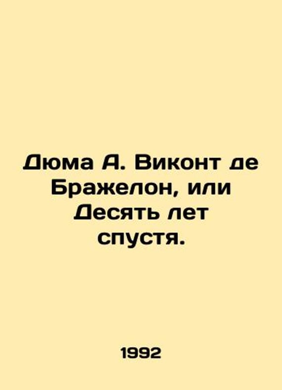 Dumas A. Viscount de Bragelon, or Ten Years Later. In Russian /Dyuma A. Vikont de Brazhelon, ili Desyat let spustya. In the 3 Book Translated from French by Vologda Soyuzblankoizdat 1992. 640 and 576 and 640 p. We have thousands of titles and often several copies of each title may be available. Please feel free to contact us for a detailed description of the copies available. SKUalba3f4a9f6f1423525.