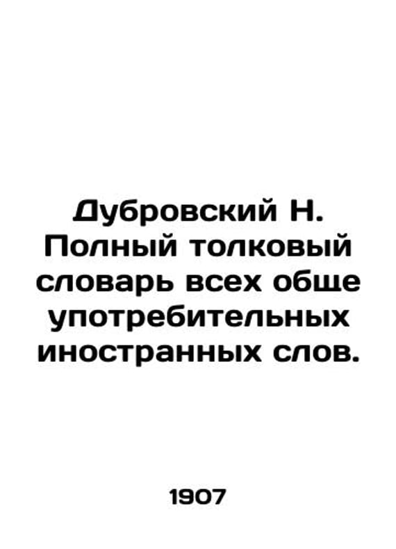 Dubrovsky N. Complete Dictionary of All Common Foreign Words. In Russian /Dubrovskiy N. Polnyy tolkovyy slovar vsekh obshcheupotrebitelnykh inostrannykh slov. Those who entered the Russian language with indication of their roots. A desktop reference book for everyone when reading books, magazines and newspapers. 19th amended and supplemented edition M. 1907. We have thousands of titles and often several copies of each title may be available. Please feel free to contact us for a detailed description of the copies available. SKUalba48e0e6b1383c143.