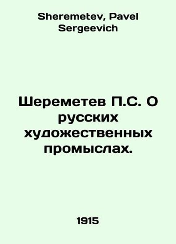 P.S. Sheremetev On Russian Art Crafts. In Russian /Sheremetev P.S. O russkikh khudozhestvennykh promyslakh. Report of the Member of the Artisanal Council of Moscow. Libs. Zemstvo Grr.P.S. Sheremetev. M. T-vo Pechatnya Yakovlev. 1915. 51c. We have thousands of titles and often several copies of each title may be available. Please feel free to contact us for a detailed description of the copies available. SKUalba4bdcb78e6291ba3.