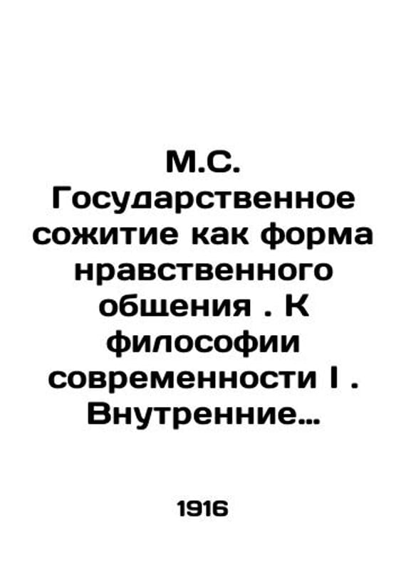 M.S. Public cohabitation as a form of moral communication. Towards the philosophy of modernity I. Internal relations. In Russian /M.S. Gosudarstvennoe sozhitie kak forma nravstvennogo obshcheniya. K filosofii sovremennosti I. Vnutrennie otnosheniya. Brockhaus-Ephron 1916. We have thousands of titles and often several copies of each title may be available. Please feel free to contact us for a detailed description of the copies available. SKUalba57c4c9709b99ecd.