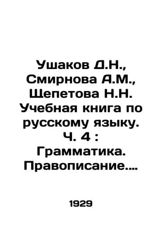 Ushakov D.N., Smirnova A.M., Shchepetova N.N. A textbook on the Russian language. Part 4: Grammar. Spelling. Pronunciation. Speech development: For 4 years of study. In Russian /Ushakov D.N., Smirnova A.M., Shchepetova N.N. Uchebnaya kniga po russkomu yazyku. Ch. 4: Grammatika. Pravopisanie. Proiznoshenie. Razvitie rechi: Dlya 4 goda obucheniya. M.: L. GIZ. (Moscow: 1st Samplotsovaya type.). 1929. 128 p. We have thousands of titles and often several copies of each title may be available. Please feel free to contact us for a detailed description of the copies available. SKUalba6e4914a692fe015.