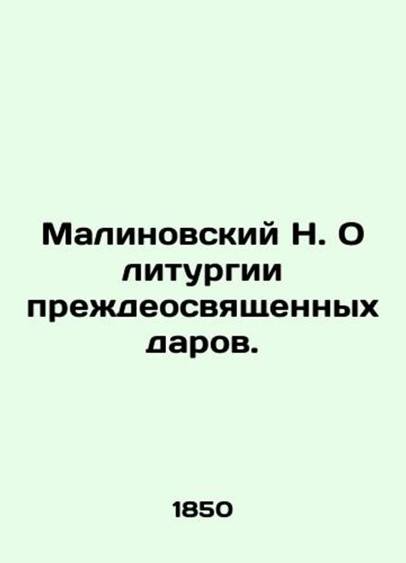 Malinovsky N. On the Liturgy of the Presanctified Gifts. In Russian (ask us if in doubt)/Malinovskiy N. O liturgii prezhdeosvyashchennykh darov. In the second part the author writes about the ritual composition of the liturgy and the mysterious sign its role in dogmatic and moral relations. SKUalba836a83e044e7d9c.