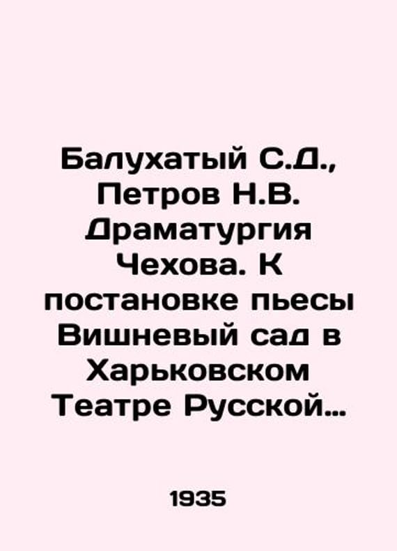 Balukhatyy S.D., Petrov N.V. Chekhovs Drama. To the production of the play The Cherry Orchard at the Kharkiv Theatre of Russian Drama. In Russian /Balukhatyy S.D., Petrov N.V. Dramaturgiya Chekhova. K postanovke pesy Vishnevyy sad v Kharkovskom Teatre Russkoy Dramy. The book was prepared for publication by A.Brodskim. Tir.3200 L. Edition of the Kharkiv Theatre of Russian Drama. 1935. We have thousands of titles and often several copies of each title may be available. Please feel free to contact us for a detailed description of the copies available. SKUalbad4174e866d41f63.