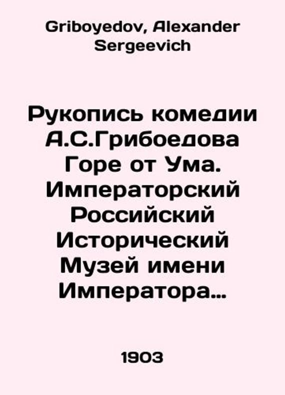 A Manuscript of the Comedy by A.S. Griboyedov Grief from Mind. Imperial Russian Historical Museum named after Emperor Alexander III. Description of Monuments. Issue III. In Russian /Rukopis komedii A.S.Griboedova Gore ot Uma. Imperatorskiy Rossiyskiy Istoricheskiy Muzey imeni Imperatora Aleksandra III. Opisanie Pamyatnikov. Vypusk III. Attached are 5 phototypic shots from the manuscript. Edited by V.E. Yakushkin (Edited by Iv.Zabelin). We have thousands of titles and often several copies of each title may be available. Please feel free to contact us for a detailed description of the copies available. SKUalbae3982da20362ce2.